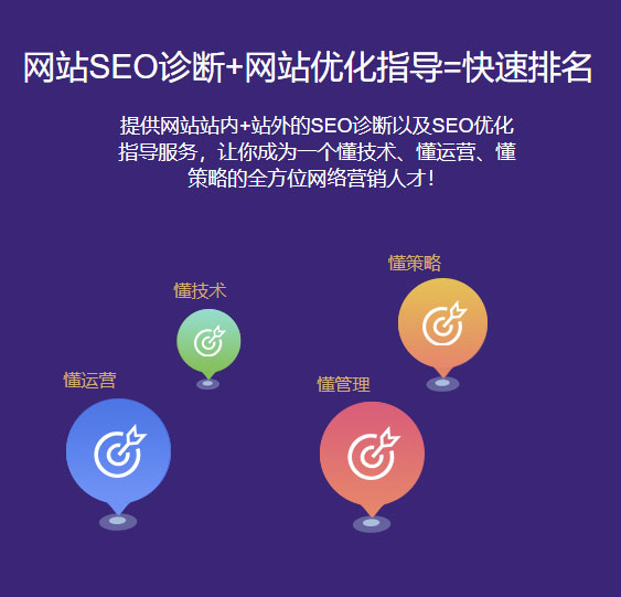 提供网站站内+站外的SEO诊断以及SEO优化指导服务,让你成为一个懂技术、懂运营、懂策略的全方位网络营销人才!