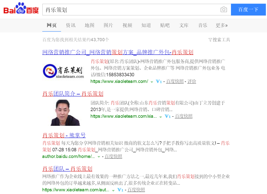 一个的品牌词,由于在互联网上没有任何竞争度,只要后期我们稍微优化该品牌,就会像肖乐策划一样实现快速霸屏。