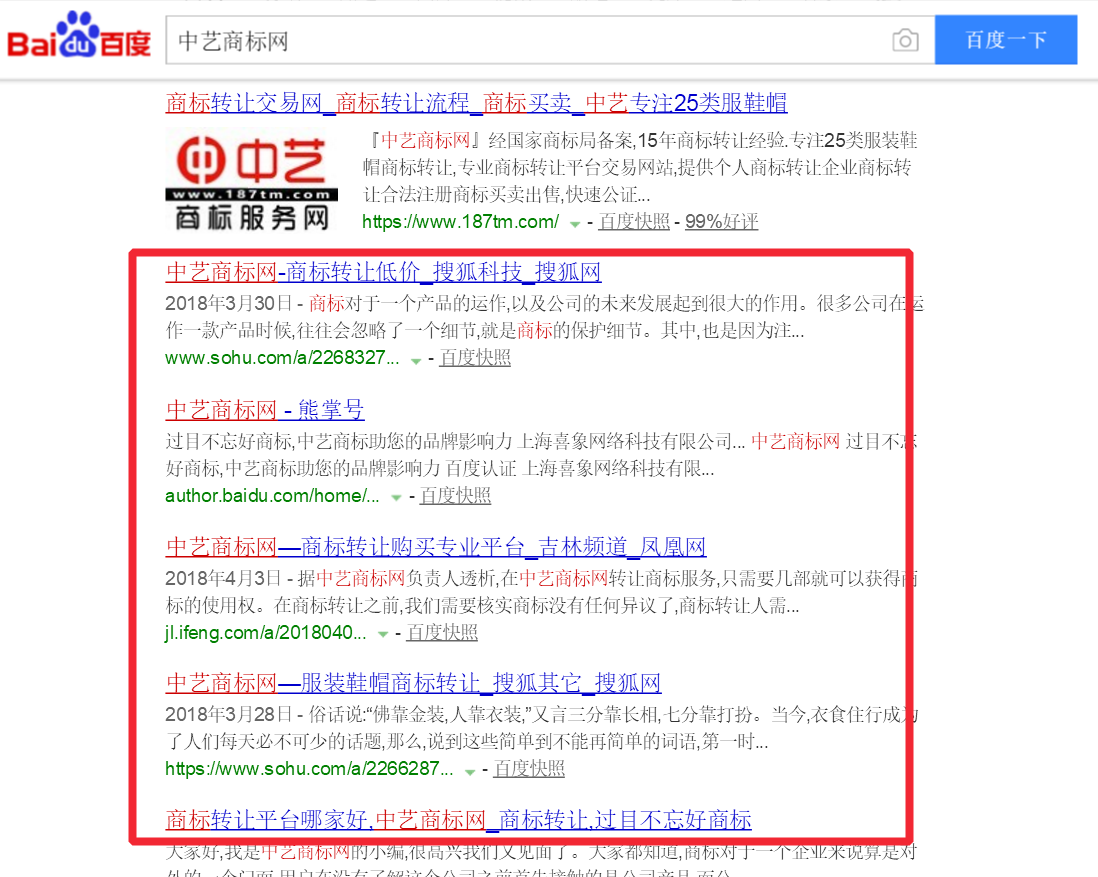 比如我们之前做的几家品牌案例(百度一下):中艺商标网、贝好佳海苔、飞黛面膜。 通过百度搜索品牌名字,就可以出现大量的品牌信息。这样就可以给潜在客户增加一定的信任感,有利于后期的成交与转化。