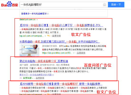 有效的百度手页推广方法,可以使得公司更好的去获得精准流量。以一体机产品为例子,从客户的角度出发,百度:一体机电脑哪款好,百度手页即可出现如下广告位。